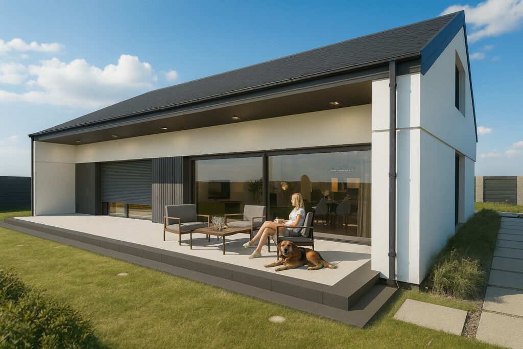 Odpowiednia orientacja budynku względem stron świata została przemyślana już na etapie projektowym – główne przeszklenia i strefy dzienne skierowano na południe, natomiast pomieszczenia techniczne, łazienki i inne mniej użytkowane przestrzenie rozmieszczono od strony północnej. Dzięki temu dom optymalnie wykorzystuje światło słoneczne przez cały dzień, co wpływa nie tylko na komfort mieszkańców, ale również na zmniejszenie zużycia energii potrzebnej do ogrzewania i oświetlenia.