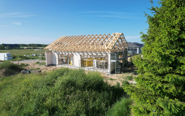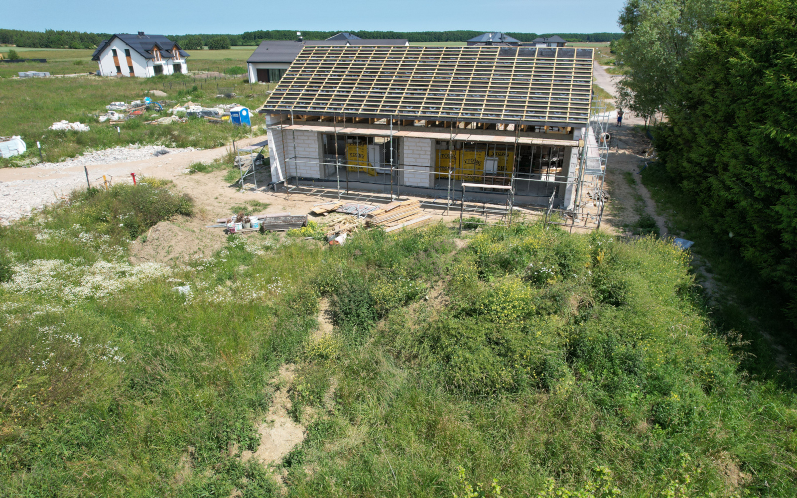 Budowa ścian działowych oraz szczytowych, montaż więźby dachowej (wiązary), wykonanie pokrycia dachowego, montaż stolarki okiennej.