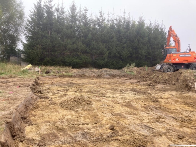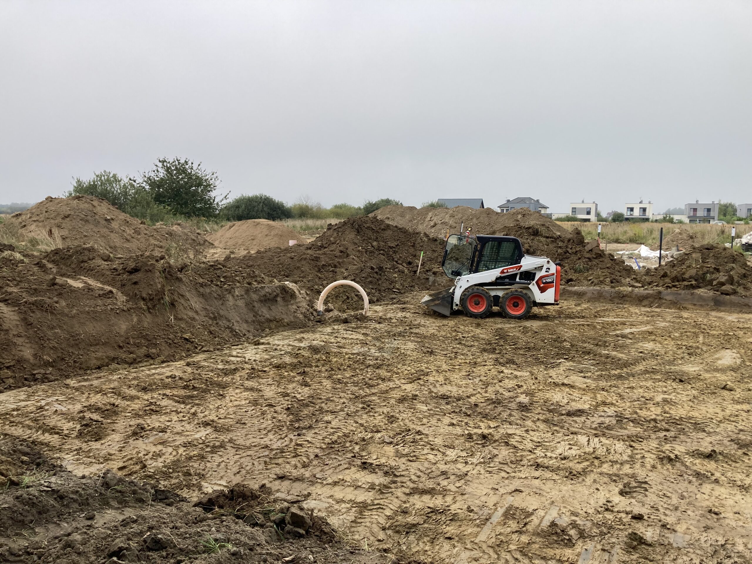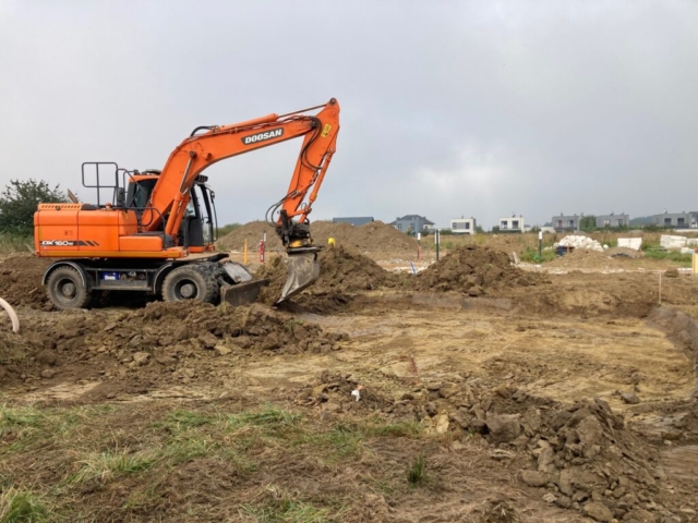 Opracowanie projektu budowlanego, przygotowanie dokumentacji projektowej, uzyskanie pozwolenia na budowę. Prace ziemne, wymiana gruntu, przygotowanie i wykonanie podbudowy pod płytę fundamentową.
